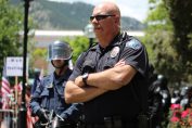 Holding US flags and shouting obscenities and hate language such as “fa–ot”, about 30 stood in front of Boulder County Courthouse behind a police barrier on Saturday.