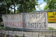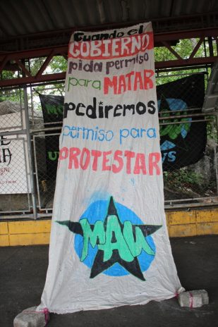 Students at four campuses of UNAH-Ceiba, Choluteca, San Pedro Sula, and the capitol Tegucigalpa are protesting the proposed reforms.   At the San Pedro Sula campus of UNAH, students were holding down campus in an occupation that has lasted about 30 days.  This action marks the third occupation this academic year.  They had been sleeping in tents and on mattresses and covered the surrounding fences with banners that read, “Pardon our mess, we are fighting for a public UNAH,” and “Protesting is a right.  Repression is a crime.”  The Honduran flag was hung on a surrounding fence, the signature posting that defines the many occupations throughout Honduras, especially among community land recuperations.honduras student protest