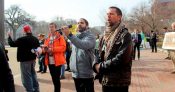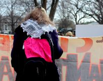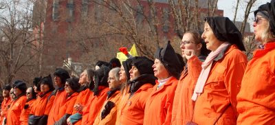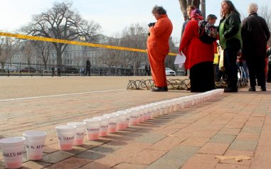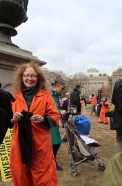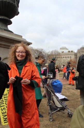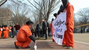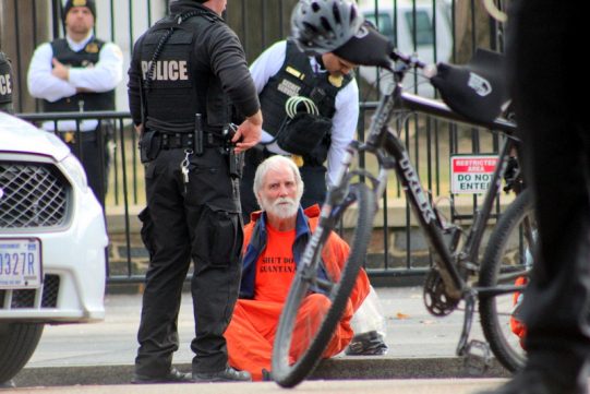Forty-one men remain incarcerated at Guantanamo. A row of activists dressed in signature orange jumpsuits with black hoods, filed in procession to an area directly in front of the White House. A prayer vigil preceded a rally where the direct action was held.
